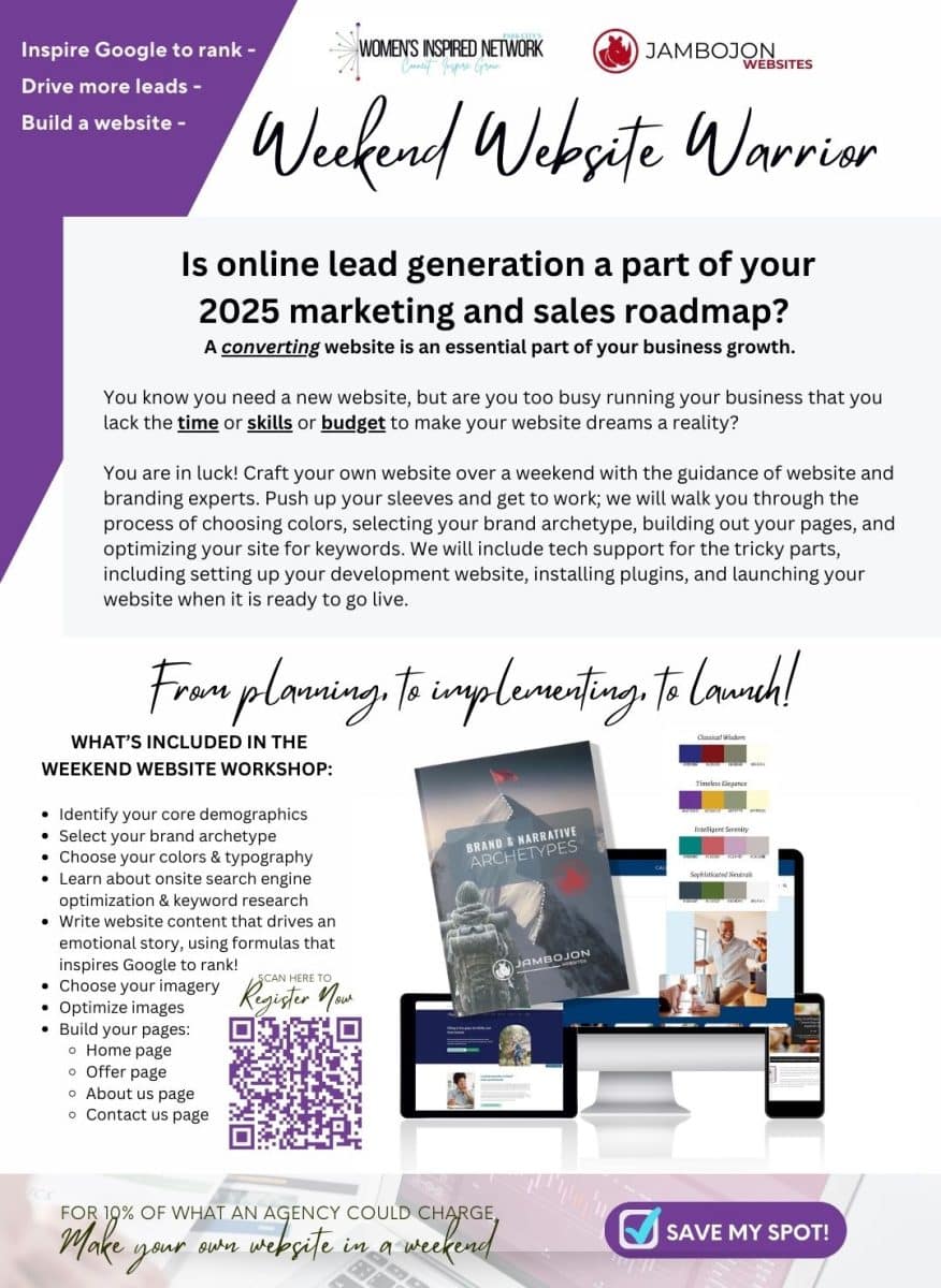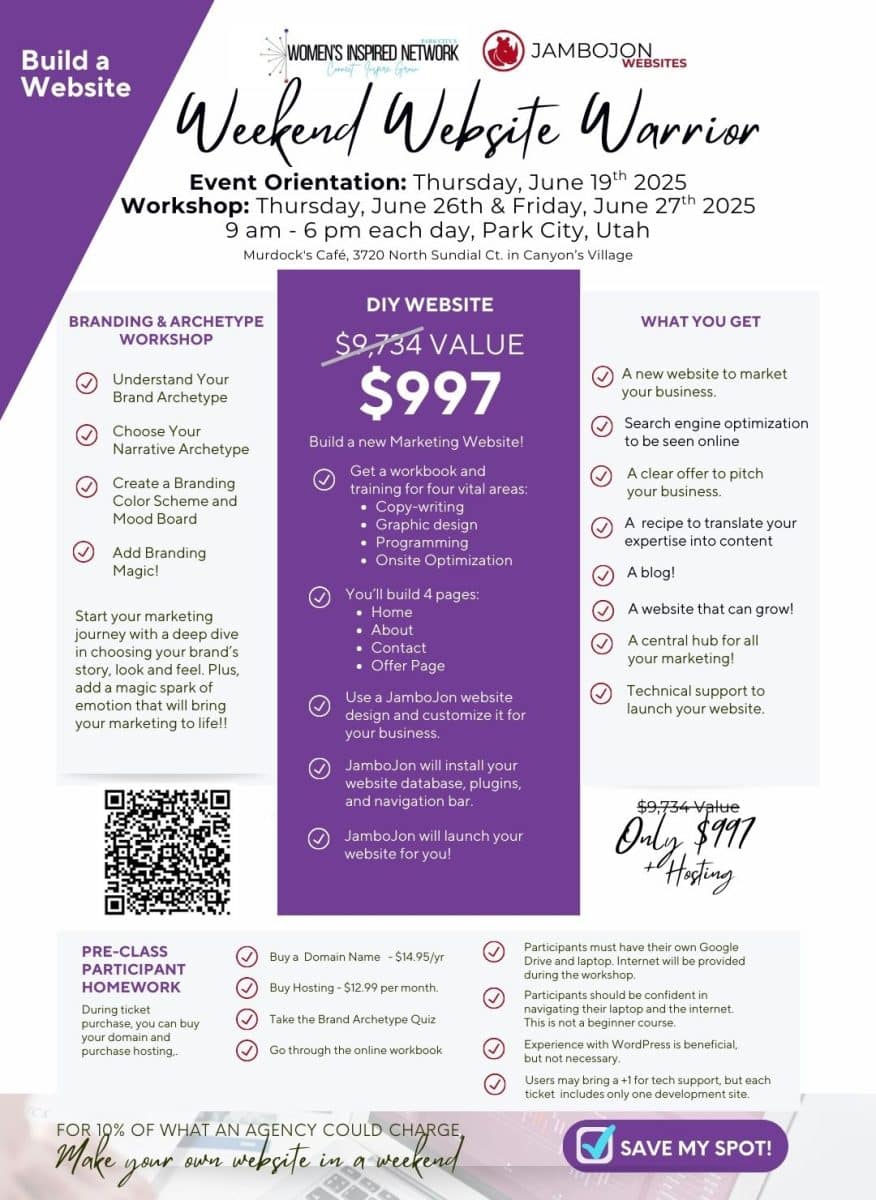 JamboJon is so excited to announce our very first Weekend Website Warrior Workshop! You deserve a website that works – without the sky-high price tag or the tech overwhelm. On June 19, 26-27, 2025, you can experience the perks of a 2.5-day, in-person DIY website workshop. It isn’t just a tutorial. It’s a roll-up-your-sleeves, boots-on-the-ground seminar where you’ll build a real, working website that looks professional and does the job right.