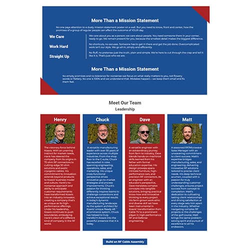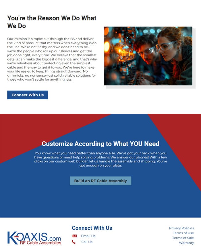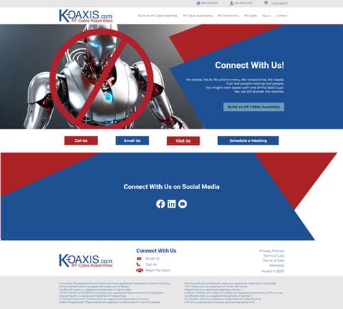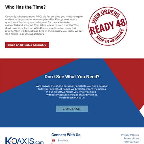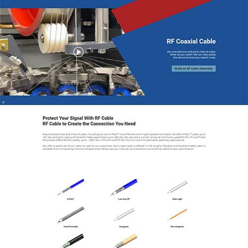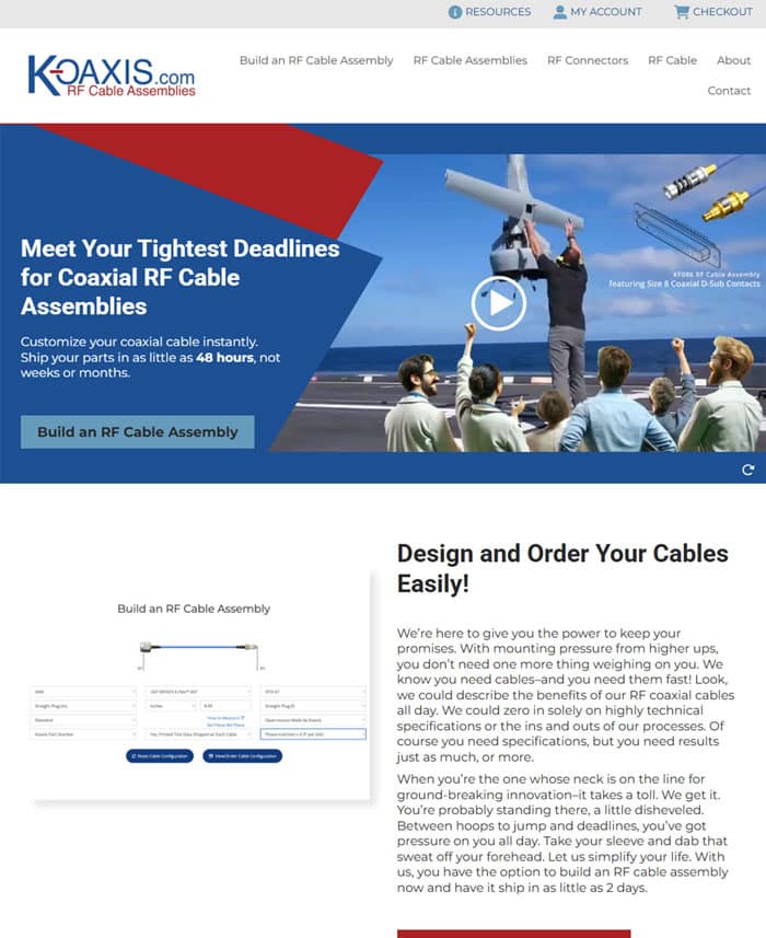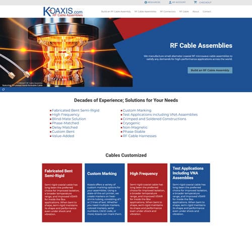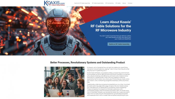 Koaxis thrives on precision and possibility. As the leader in custom coaxial cables and assemblies, they set a new industry standard with its online RF cable builder – a fast, flexible platform that enables their clients to customize and ship high-performance cable assemblies within 48 hours. For organizations like Boeing, the Pentagon, and other major players who can’t afford to wait, Koaxis delivers exactly what they need, when they need it. They needed a website update worthy of that same innovation. One that communicates their state-of-the-art capability and matches the power of the tool that changes how their customers build.