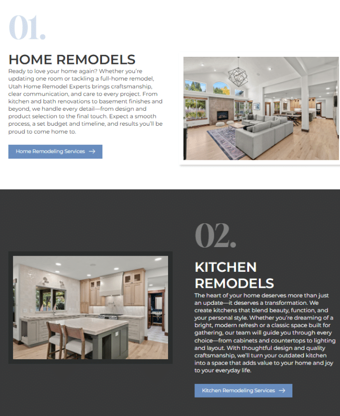 When Utah Home Remodel came to JamboJon, they already had a website, but needed a complete redesign to elevate the user experience and strengthen search visibility. They needed to attract more traffic, convert more visitors into clients, and streamline their processes for high-end home renovation work. More than anything, they needed a site that showcased their expertise and craftsmanship. Their portfolio had to shine, and their brand needed to feel credible.